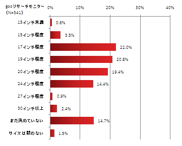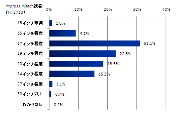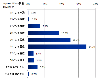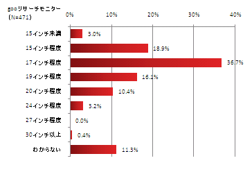 PC用モニター種類別の液晶モニター新規購入意向 現状より大型のサイズを希望。Watch読者では「24インチ程度」が4割弱続いて、今後購入したい液晶モニターについてみてみる。現在最も使用されているものと同じ「17インチ程度」が最も高いが、19インチや20、24インチといったサイズの希望も高く、現状より大きな画面サイズを望んでいる。一方、Watch読者はさらに大画面のサイズを希望する傾向にあり、「24インチ程度」が35%で最も高い。