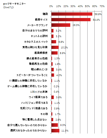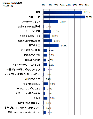 主に使用している液晶モニターのメーカー(ノートPC単体を除く) 購入のポイントは「値段」と「画面サイズ」液晶モニター購入時に重視した点では、「値段」や「画面サイズ」を重視した比率が高く、「メーカーやブランド」が続いている。Watch読者でも同様の傾向にあるが、gooリサーチモニターに比べて「画面解像度」を重視した比率が高い。