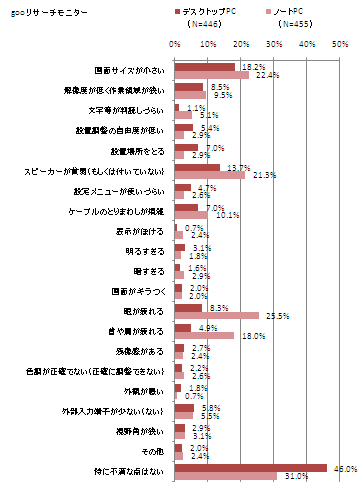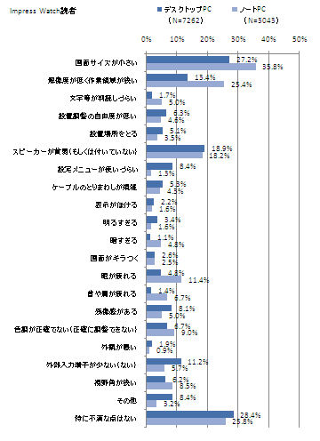 購入時に重視した点(複数回答:3つまで) デスクトップPC用液晶モニター利用者の半数は「特に不満な点はない」現在使用している液晶モニターで不満を感じている点では「特に不満な点がない」がデスクトップPCで46%、ノートPCで31%と高く、液晶モニターに対する不満は低い。 Watch読者では「特に不満な点はない」は3割弱にとどまり「画面サイズが小さい」がデスクトップPCで27%、ノートPCで36%と高い。