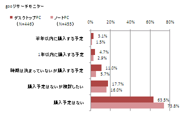 PC用モニター種類別の使用している液晶モニターに対する不満点(複数回答:3つまで) 7割前後は「購入予定はない」現在使用している液晶モニターとは別に、新たにモニターを単品購入する予定があるか尋ねたものである。(パソコン自体の買い替えによる交換を含まない) 不満点が少ないことからも「購入予定がない」が7割前後と高い。一方、Watch読者では、「購入予定はない」が最も高いものの、デスクトップPCを使用している人において、「時期は決まっていないが購入する予定」が3割弱とgooリサーチモニター比べて高い。