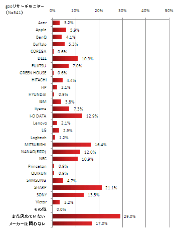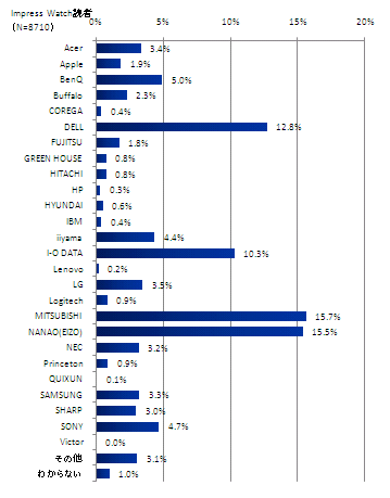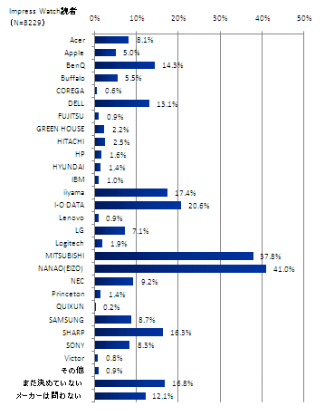 今後購入したい液晶モニターの画面サイズ “液晶といえばSHARP”というイメージの一般消費者。Watch読者は専門メーカー志向次に希望メーカーであるが、「まだ決めていない」が3割と高いものの、液晶テレビで知名度の高い「SHARP」が21%で最も高い。一般消費者の中では“液晶といえばSHARP”というイメージが強いといえる。一方、Watch読者の場合は、使用しているメーカーでも人気の高い「NANAO(EIZO)」や「MITSUBISHI」が4割前後と、他のメーカーに比べて突出して高い。