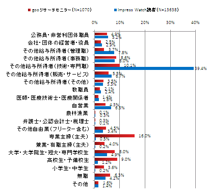 大型化やワイド化、ハイビジョン対応、各種入力端子やTVチューナーの搭載、低価格化など、パソコン用液晶モニターを取り巻く環境は日々進化している。ワイドスクリーンに最適化されたWindows Vistaやフルハイビジョン映像を堪能できる次世代DVD機器の普及に加え、動画やゲームを大画面で楽しみたいという読者も多いのではないか。そんな「液晶モニター」に関して、インプレスR&DとImpress Watch、gooリサーチが共同で調査を行った。日ごろからインターネットに触れ、最新動向に感度の高いImpress Watch読者(以下Watch読者)と、Watch読者に比べると一般消費者層に近いgooリサーチ消費者モニター(以下gooリサーチモニター)の2つの層に対する比較内容を掲載している。 なお、本記事では全設問36問中、自宅での使用に関する項目のみ掲載している。職場での液晶モニターの使用に関する項目や本調査のデータ販売、その他の調査報告などはAll in One INTERNET magazine リサーチForumをぜひご覧いただきたい。 液晶モニターの使用率は4割、Watch読者では6割まずは自宅でどんなタイプのPC用モニターを使用しているかを調べてみよう。 一般消費者に近いgooリサーチモニターでは、デスクトップPCに液晶モニターを接続している人と、ノートPC単体を使用している人が4割強でほぼ同じ比率となった。 一方で、Watch読者ではノートPC単体の使用は2割にとどまり、「デスクトップPCに液晶モニターを1台接続」が5割強、「デスクトップPCに液晶モニターを複数台接続」も1割弱と、6割強のユーザーが液晶モニターを使用している。