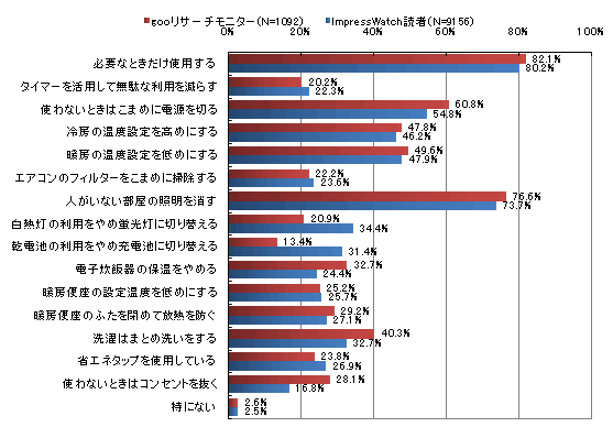 近年、CO2の大量排出などによる地球温暖化が大きな問題となり、京都議定書では全世界的なCO2削減基準が設けられた。日本でも「クールビズ」に代表される温暖化対策の具体的な取り組みが行われ、消費者の”エコロジー”に対する意識は変化している。メーカー各社も低消費電力や再利用素材の使用などを新製品のPRの1つとして重視する時代となった。 今回は、家電やPCなどのIT関連機器に関するエコ度調査と題し、購入時や利用時、及び廃棄時にどのくらい”エコロジー”を意識しているかをインプレスR&DとImpress Watch、gooリサーチが共同で調査を行った。日ごろからインターネットに触れ、最新動向に感度の高いImpress Watch読者(以下Watch読者)と、Watch読者に比べると一般消費者層に近いgooリサーチ消費者モニター(以下gooリサーチモニター)の2つの層に対する比較内容を掲載している。 なお、本記事では全設問18問中、基礎的な設問の単純集計のみ掲載している。職場での液晶モニターの使用に関する項目や本調査のデータ販売、その他の調査報告などはAll in One INTERNET magazine リサーチForumをぜひご覧いただきたい。 「必要なときだけ使用する」や「人がいない部屋の電気を消す」が8割前後はじめに、日常生活において家電製品(パソコンを除く)を利用する際に行っている”エコロジー”活動を尋ねてみた。「必要なときだけ使用する」や「人がいない部屋の電気を消す」は基本的な省エネ対策であり、8割前後と実施率も高い。他の項目では、gooリサーチモニターに比べWatch読者において蛍光灯や充電池に切り替えているユーザーの比率が高いのが特徴的である。