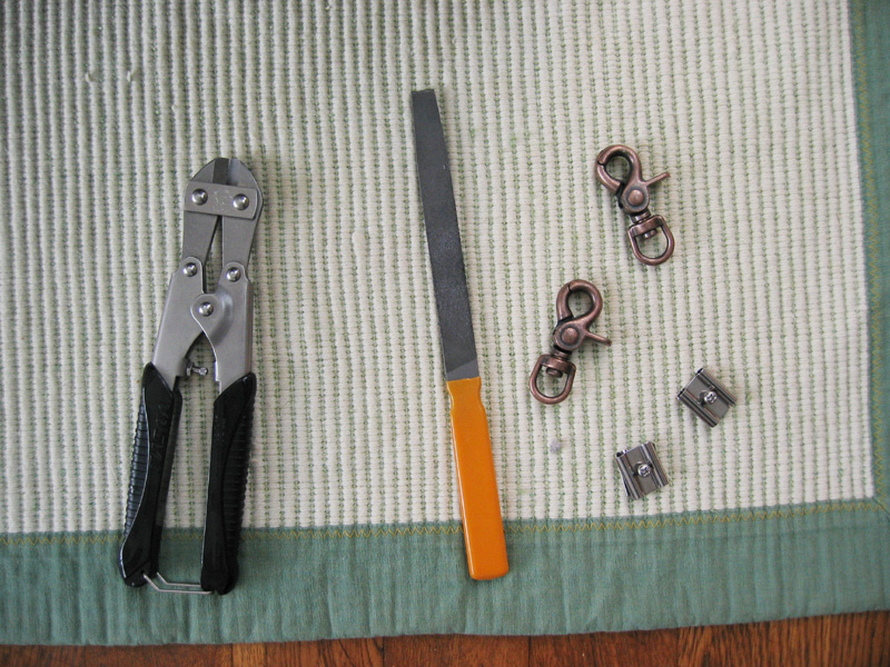 用意する物は、ネットを切る「ステンレスカッター」「金属用ヤスリ」「ナスカン」「蝶番」他にラジオペンチ、上部ドアにする金網(使わなくなったケージの敷いてあるネットを使用)。