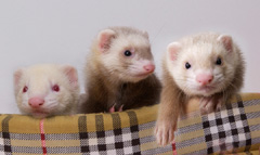いたちと言うと童話に出てくる悪いイメージがあるかもしれない。しかしそのかわいらしさは、一度見つめ合うと虜になってしまうほどだ。実際ペットとして飼うとなると、いたちの中でも「フェレット」が10年ほど前にブームになり、第3のペットとして地位を確立したのは記憶に新しい。しかしまだまだよく知らない人が多く、散歩していると「ねずみですか?」ならまだ良いが「野生動物をかわいそうに・・」との声も聞く。いやいやフェレットは野生ではないのですよ! フェレットの歴史は古く、古代エジプト時代から骨が出てきたりするなど、3000年前から飼育されていたと考えられているのだ。レオナルド・ダ・ヴィンチの有名な画に「白貂を抱く貴婦人」がある。これはフェレットのアルビノと言う説が有力である。なぜなら他のイタチ種は人になつくことがほとんどなく、創作した画としてもフェレットが居たという事実があるからに違いない。高貴な人たちのペットとして飼われていたとも考えられている。一般には狩猟のためにフェレットがウサギの穴に入り、ウサギを追い出し狩猟の手助けしたり、猫のようにネズミ駆除のために飼われていたようだ。いまだにヨーロッパの空港などでウサギ狩りに使われているという。あと悲しい事実だが、実験動物やら毛皮用だったりもした(T.T)