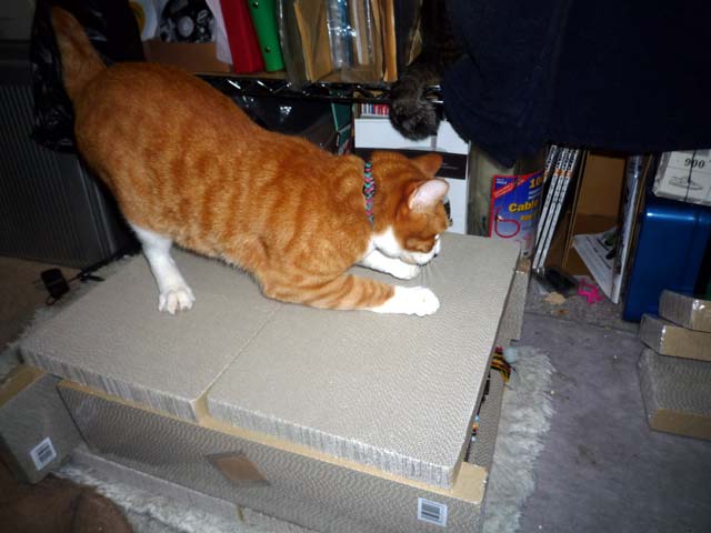 [08] 蓋をしてみたところ、早速上に載るスタッフ3号。まだ早いっつーの。ただ、PCの出来上がりに期待が持てそう。