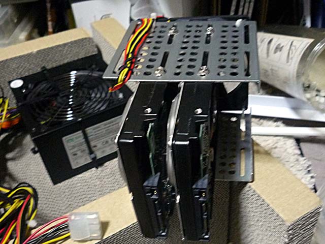 [28] 電源はケーブルタイを使って十字型に固定。で、HDDはPCショップで売っていたマウンタを使い固定。