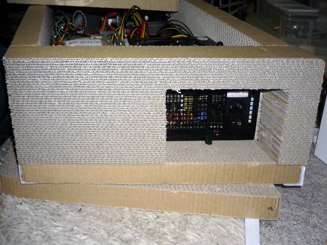 [38] 電源ケーブルの装着を考え、電源部のみくりぬいてみた。HDD用のファンはダンボール越しに十分吸気できると判断してそのまま。
