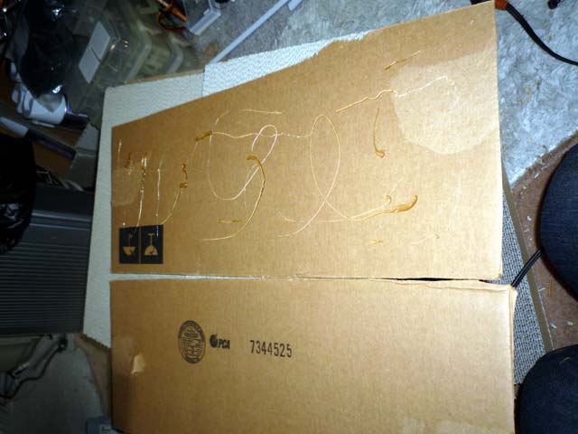 [39] マザーボードのバックパネル側の壁を製作。まず適当に丈夫な段ボール(今回はIBMの101キーの箱をバラしてみた)を2枚重ねにする。