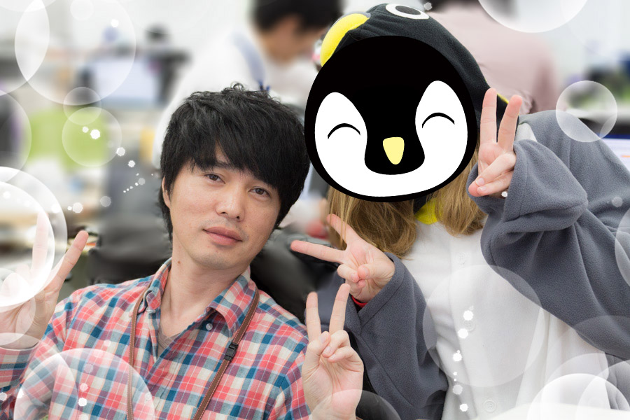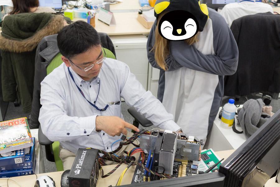 自席にてPC自作の研究を行なう「AKIBA PC Hotline!」編集長に尊敬の眼差しを注ぐペンギンさん