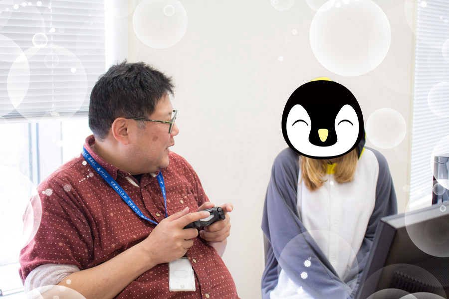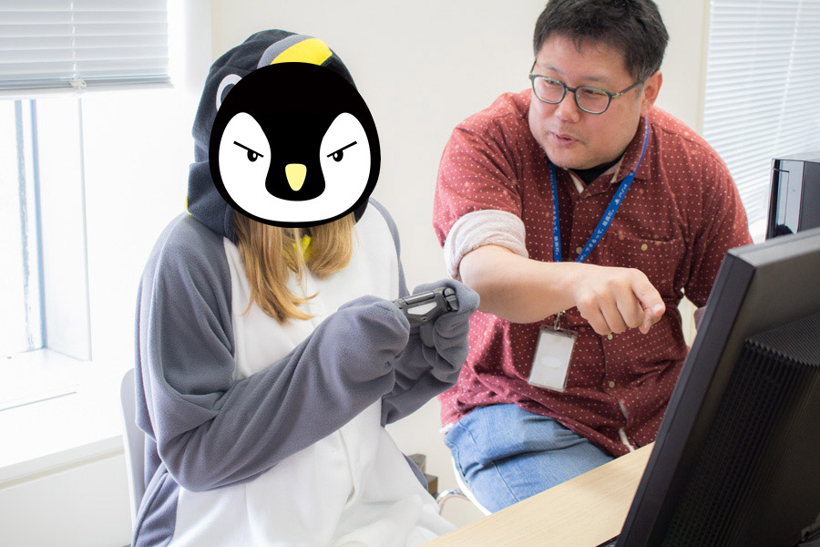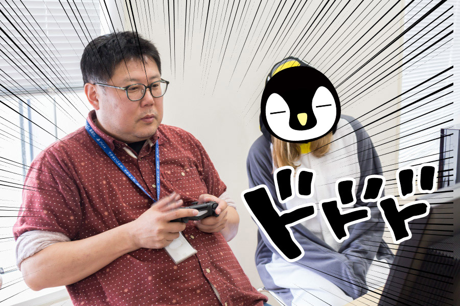 常人の域を超えたゲーミング指さばきでゲーム攻略中の「GAME Watch」編集長を見学社内を片端から癒しまくるペンギンさん。ここまで来ると立派な福利厚生だ。弊社では現在、鋭意採用活動を展開中だが、マ◯ナビの会社情報に太字で「ペンギン完備」と書いておくのはどうだろうか。今年の社長賞はもらった。