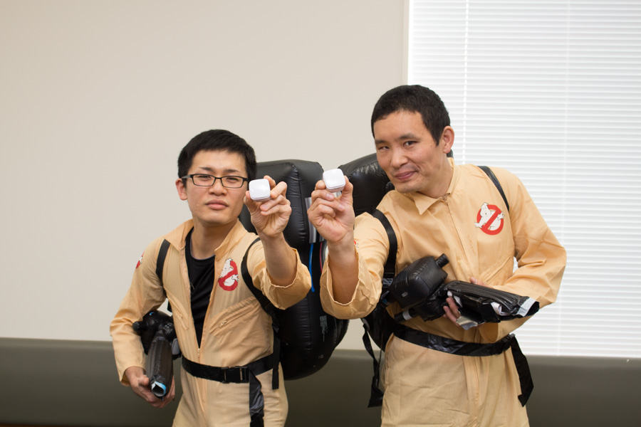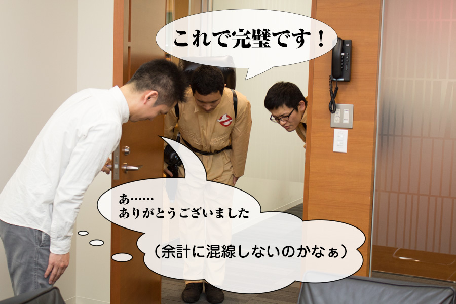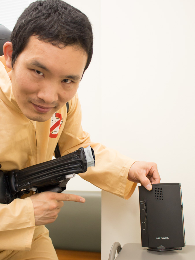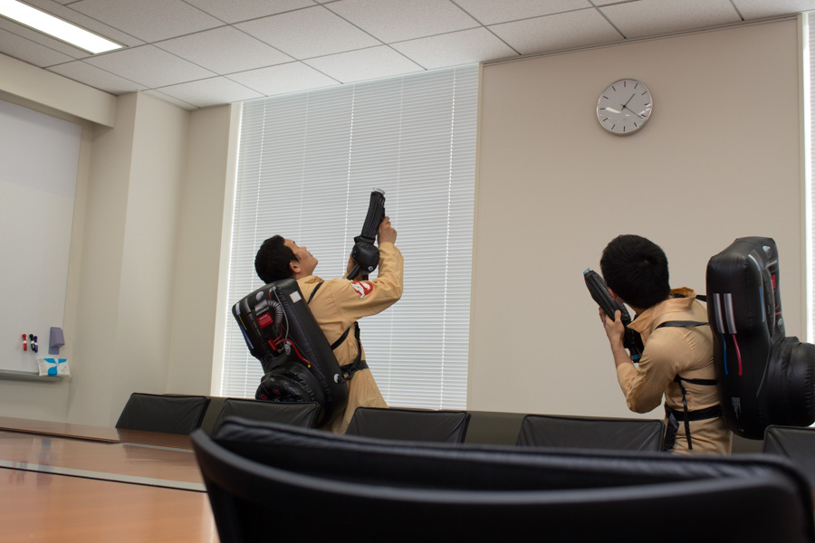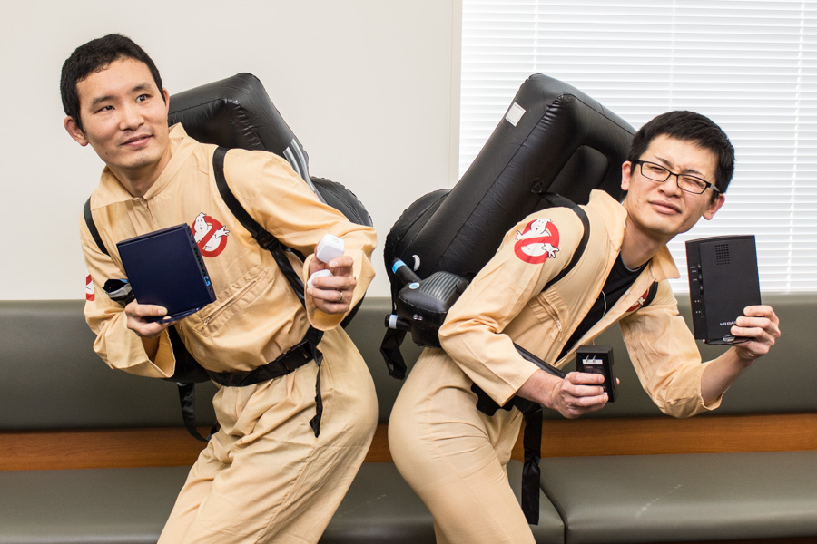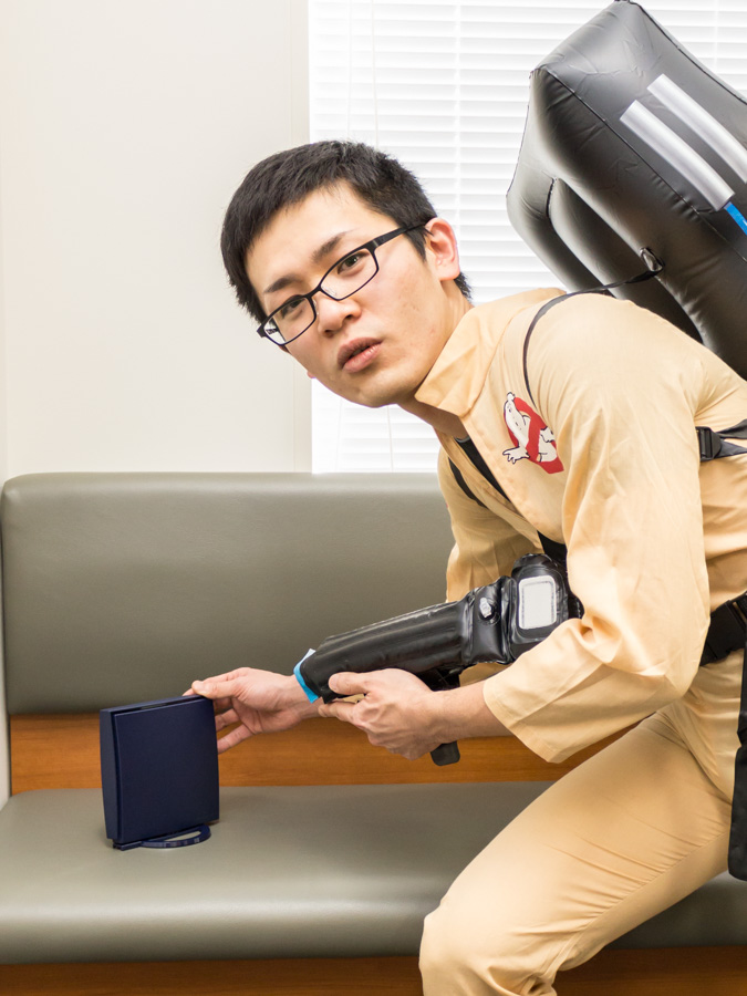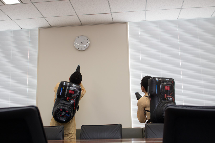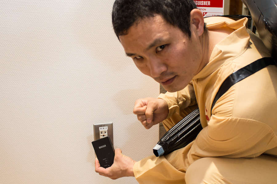 同社は今回の発表に合わせ、無線LAN混線バスターズの実際の活動風景を記者らに公開した。干渉電波を効果的に除去するために開発した特殊装置「プロトン・パック(ビニール)」を背負う2人組の男性が、不安定な電波状況の原因を手際よく探り、確実に排除したうえで、無線LANの使用状況や環境に合わせてチョイスした同社製品を前のめりの姿勢で売り込んで設置していく姿を披露した。ここでは、無線LAN混線バスターズの活動の詳細を紹介する。