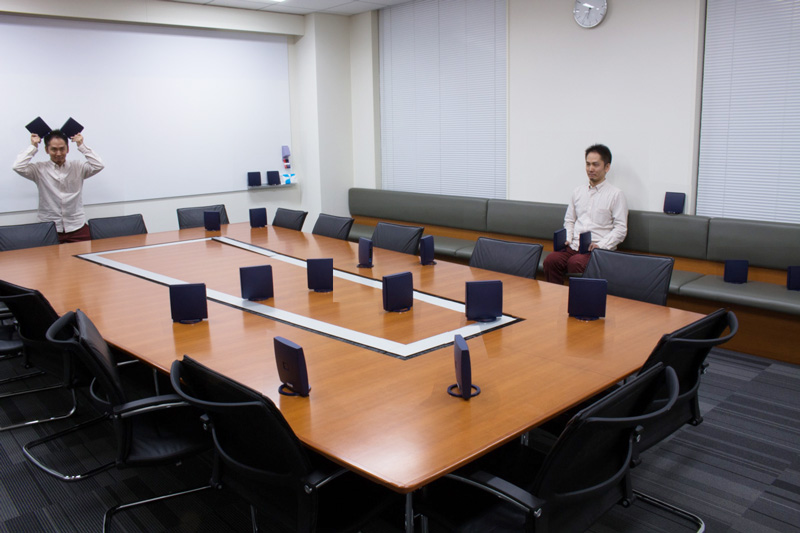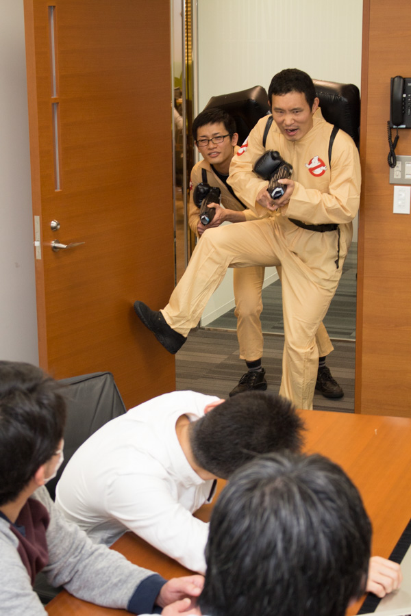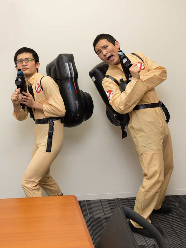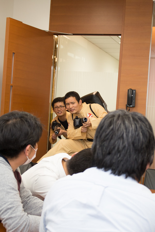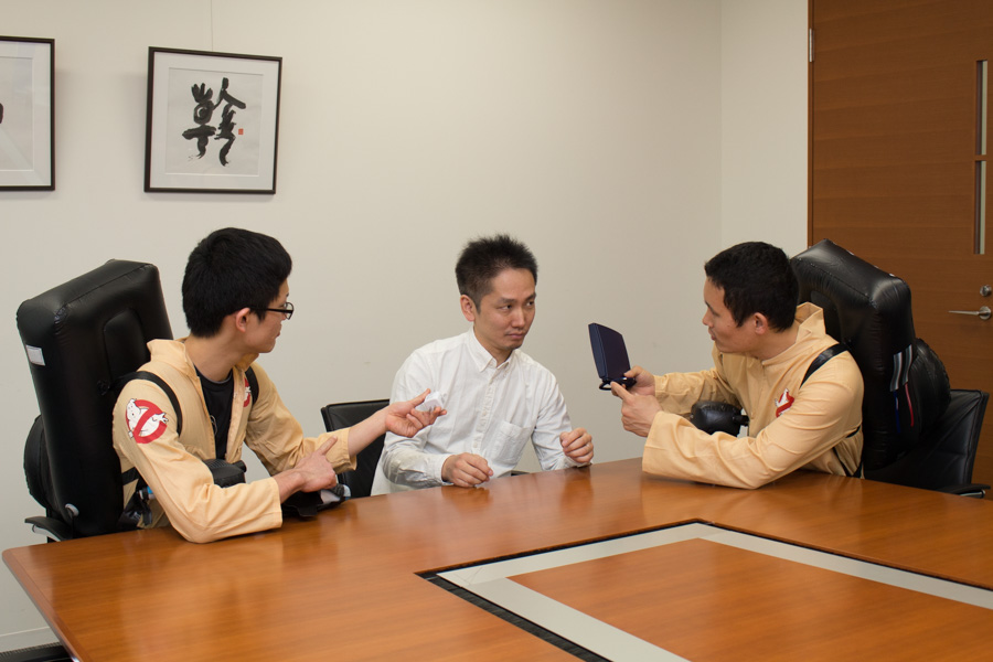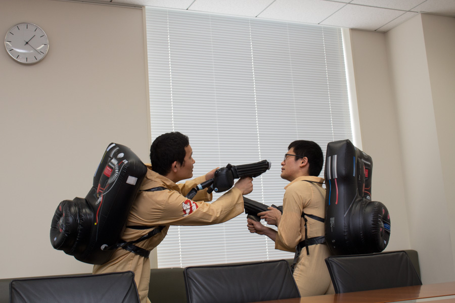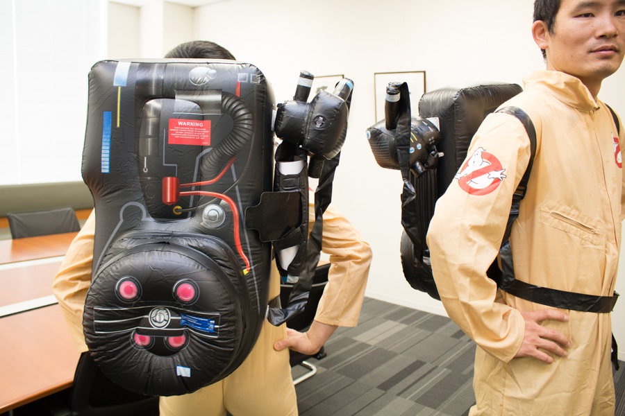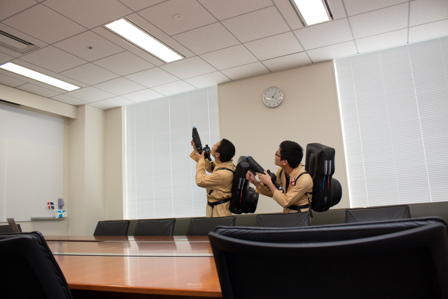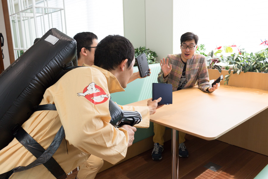 同社は今回の発表に合わせ、無線LAN混線バスターズの実際の活動風景を記者らに公開した。干渉電波を効果的に除去するために開発した特殊装置「プロトン・パック(ビニール)」を背負う2人組の男性が、不安定な電波状況の原因を手際よく探り、確実に排除したうえで、無線LANの使用状況や環境に合わせてチョイスした同社製品を前のめりの姿勢で売り込んで設置していく姿を披露した。ここでは、無線LAN混線バスターズの活動の詳細を紹介する。