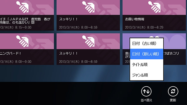 筆者はレグザサーバー「DBR-M190」で、6つの放送局をおよそ1週間分録り貯めているので、一般的なDLNAプレーヤーソフトでは番組探しが大変だ。しかし、「StationTV Link」は、アイコンによるジャンル色分け表示となり、しかもタイトル順やジャンル順で並び替えができるので、番組探しはかなり快適だった。