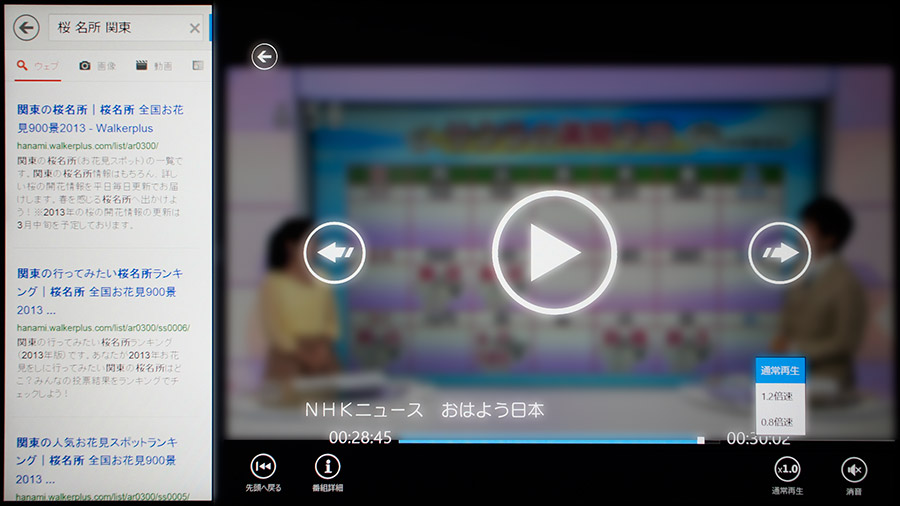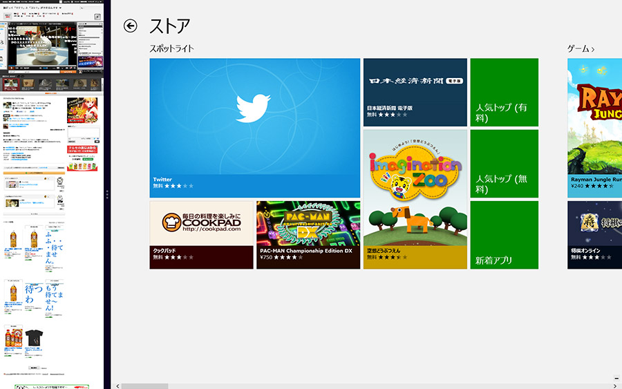 タッチ操作で手軽にたくさんの番組を探し、快適に番組を楽しめるのは便利だが、さらにWindows 8ならではと言えるのが、アプリのスナップで、画面のサイドにもう一つアプリを表示できることだ。