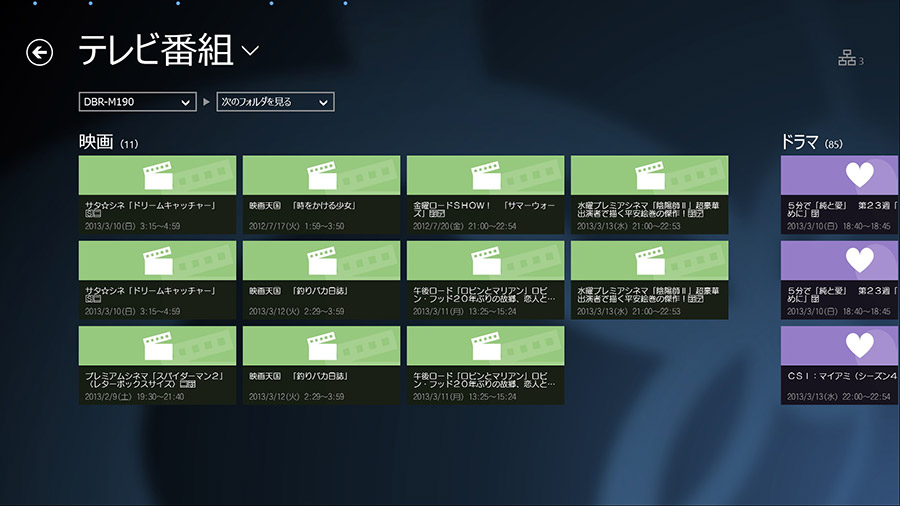 アプリを起動すると、家庭内LANに接続しているDLNAサーバー機器を自動的に巡回し、メディアが網羅的にリストアップされる。BDレコーダーの番組は「テレビ番組」のところに再生可能なコンテンツが次々に表示された。BDレコーダーが複数台ある場合、それらは特に設定しなければ時系列などでまとめて表示してくれるので、目当ての番組を探しやすい