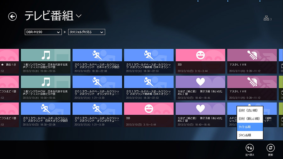 | ズラリと日付順にならんだアイコン。筆者宅の2台のBDレコーダーのうち、1台は「全録」のレグザサーバーなのでファイル数も膨大だが、タッチでスクロールも快適 | タイトルの配列は日付のほか、タイトル順とジャンル順も選べる。 |