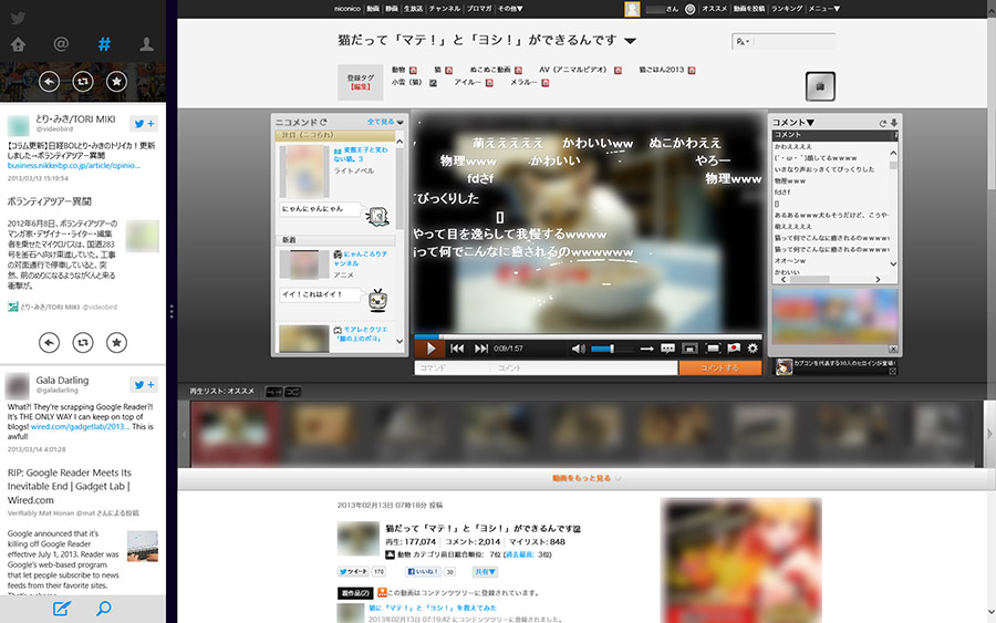 「StationTV Link」によるテレビ視聴では、同時にtwitterを確認するような使い方が便利だろう。また、僕自身がテレビ視聴をしながらよくやるのが、テレビ放送を見ながら気になった事柄などを検索してより深掘りすること。こんなことも、Windows 8ならば1台で手軽にこなしてしまう。