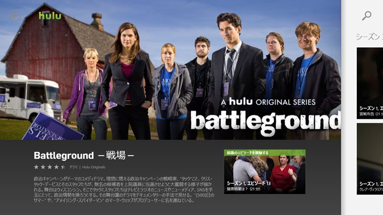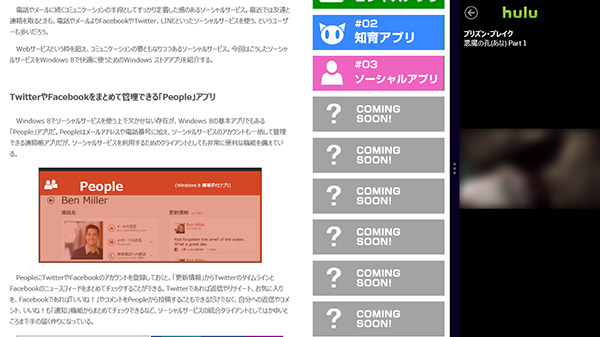 テレビ視聴のほかにも、Window 8のWindows ストアアプリにはさまざまな動画サービスのアプリがある。月額980円で豊富な動画コンテンツが見放題の「Hulu」も視聴用アプリが無料で提供されている。無料トライアルもできるので、気軽に試すといいだろう。Huluはハリウッド作品の映画も充実しているが、さらに魅力なのは海外ドラマが極めて充実していること。DVDをセットで買い集めるのに比べたら、月額980円はかなりお得だと言えるだろう。