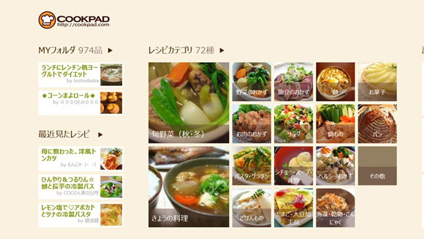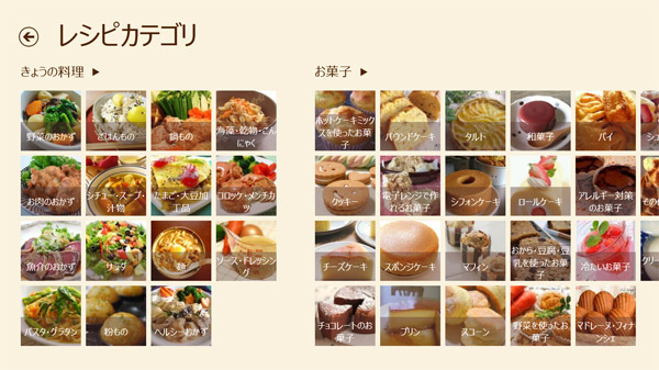 | レシピカテゴリがずらりと並んで選ぶのも楽しい | 各レシピは、ヨコに置くとスーパーで配られている「レシピカード」のような作り |