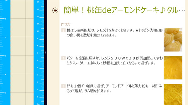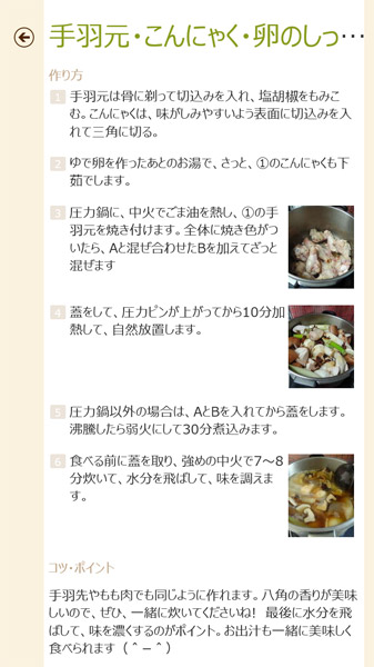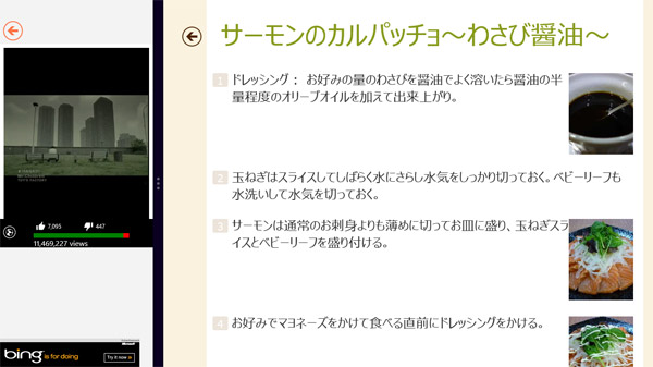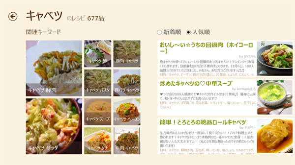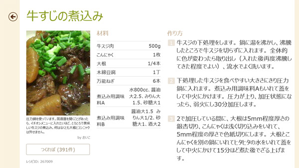 ただ、機能はシンプルなのに快適。サムネイル表示される料理の写真が大きく、何を作ろうか迷っているときにはとても楽しく選べて、料理をしたい気分にさせてくれる。インターネットブラウザーでホームページを表示しているときとも違い、紙の本を見ているときの感覚に近い。スマホのアプリだと、あらかじめ作りたい料理や使いたい食材が決まっているときには便利なのだが、Windows 8のタブレットで見ているときのようになんとなく探す、という使い方には実はあまり向いていない。クックパッド愛好者にとって、また新しい使い方が増えたといえるだろう。
