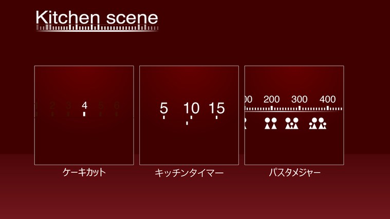 まずはタイマーやメジャーなどのツール類だ。タイマーやストップウォッチはWindows ストアアプリにも豊富なので、好きなものを選べるが、techGarageの「Kitchen Scene」は「ケーキカット」「キッチンタイマー」「パスタメジャー」の3つのツールがひとつになった便利アプリ。エンジニアの育成を行うtechGarageの学生が主導で、マイクロソフトとの共同プロジェクトとして作成されたWindows ストアアプリだ。