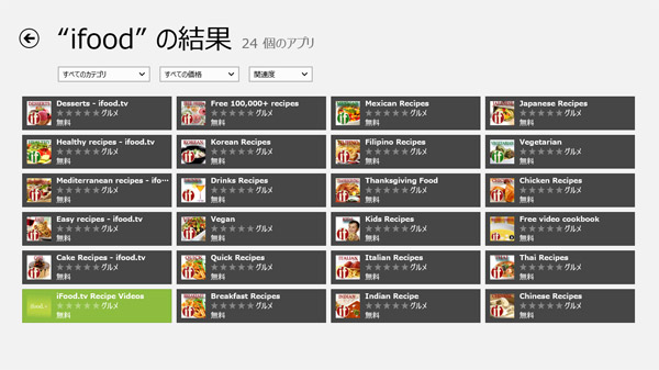 | [設定]→[基本設定]→[選んだ言語のアプリを見つけやすくする]を[いいえ]を選ぶと日本語ソフト意外も表示される | 「iFood」関連だけで24種類もアプリがある |
