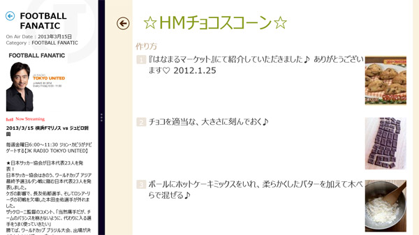 また、料理中は地味で時間がかかる作業の連続。Windows 8ならスナップで複数の画面が使えるので、たとえば「YouTube Play」を表示させてビデオクリップを聞きながら作業するとか、「J-WAVE PODCAST STATION」でラジオ番組を聴きながら作業するなんて作業もラクラク。デスクトップ上で、IPサイマルラジオの「radiko.jp」を使ってバックグラウンドで再生しても十分だ。Windows 8タブレットなら、1台でレシピからキッチンツール、ラジオやテレビの役目までしてくれて、キッチンでマルチに活躍してくれる。