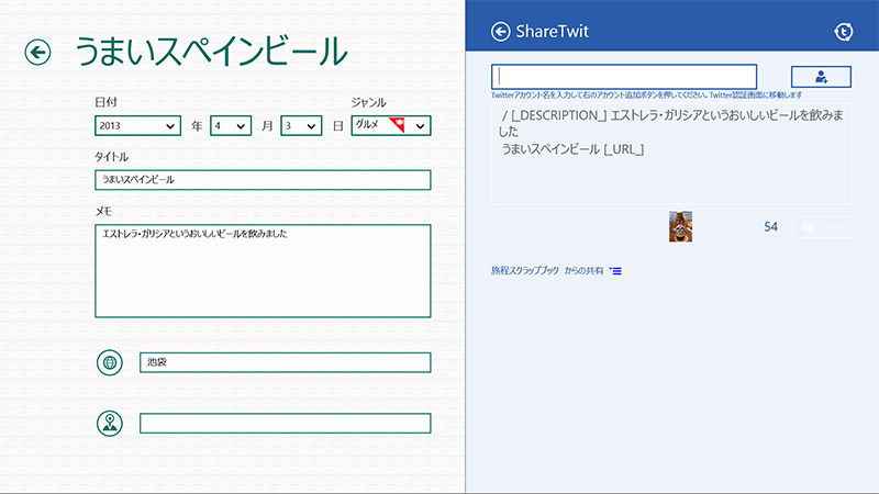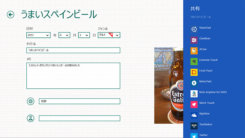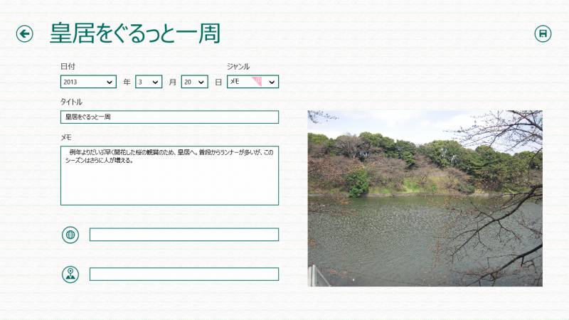 機能自体はごくシンプル。タイトル、日付、メモ(本文)の記入に加え、関連リンクの設定や、写真の添付などが行える。テキストエディターほどシンプルすぎず、かといってブログ記事を書くほど複雑ではない。アプリ自体にはソーシャル機能はなく、個人の備忘録的な用途に徹しているが、Windows 8のチャームから呼び出せる「共有」で、様々なアプリやソーシャルと連携することもできる。
