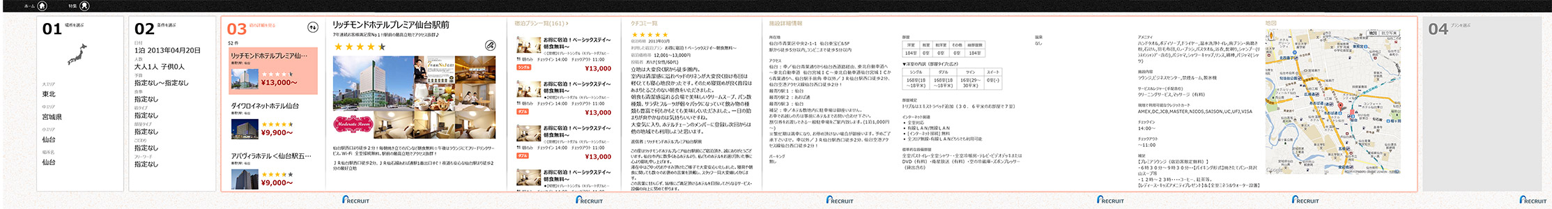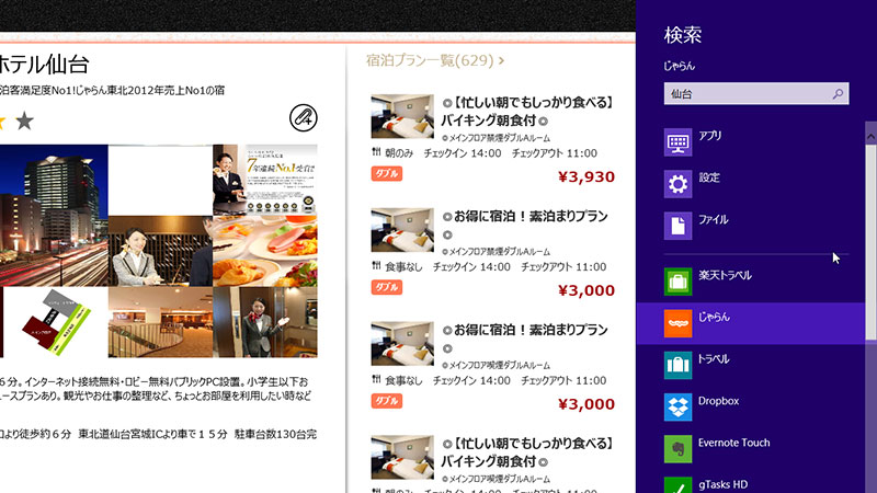 Windows 8のチャームを出し、「検索」で行きたい地域を入力。たとえば「仙台」と入力して「じゃらん」アプリを選択すると、「じゃらん」アプリに仙台のホテルや旅館が表示される。満足いく宿泊先が見つからなければ、再びチャームを出すと、検索フォームには「仙台」が残っているので、今度は「楽天トラベル」アプリを選択……といった具合で、様々なアプリを次々に検索していくことができる。