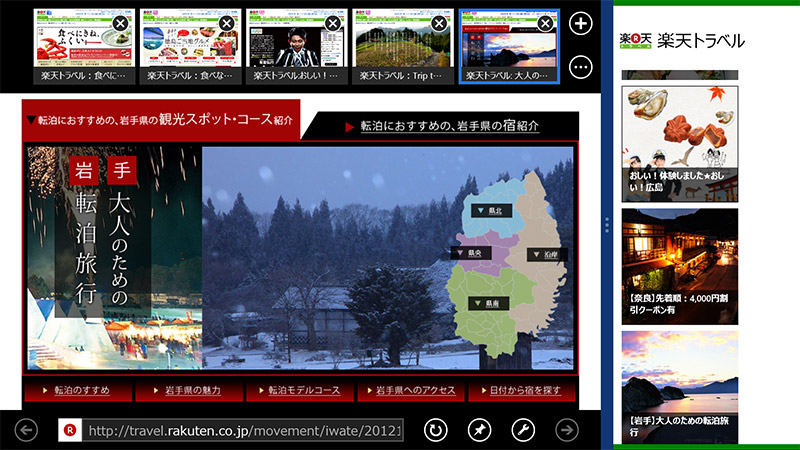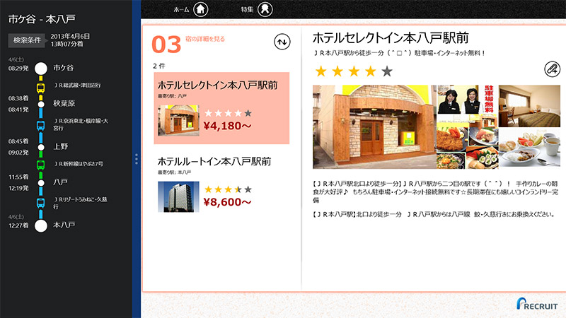 チャームからの検索は、対応するWindows ストアアプリをインストールしておけば利用可能。ということで、ここからは旅行の宿泊先などを検索するのに便利な旅行代理店系の公式アプリを紹介していこう。国内旅行なら「じゃらん」や「楽天トラベル」などがWindows ストアアプリを公開中だが、とりわけWindows 8ならではのルック&フィールをUIにうまく取り込み、使いやすいのが「じゃらん」だ。