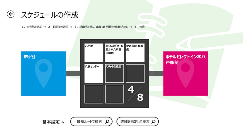 プランニング機能は、出発地と目的地のほか、経由地を最大8カ所までを「クリップ」から指定することにより、滞在時間も考慮した旅程を表示してくれる。旅程は複数保存できる。例えば2泊3日旅行の1日目、2日目……という具合に登録しておき、後から呼び出すことが可能だ。帰り道に乗る電車の発車時刻を紙にメモしておくのもいいが、プランニング機能ならよりスマートだ。