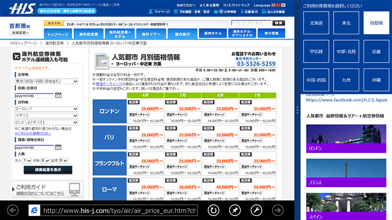 ○○に旅行に行きたい!となった場合、まず「じゃらん」や「H.I.S」といった旅行代理店のサイトを開き、目的地を入力して旅行プランを探し、満足いく旅行プランがなければまた次のサイトに……という作業を繰り返す人は多いと思うが、ここはぜひ、Windows 8の「チャーム」とWindows ストアアプリを活用してみよう。