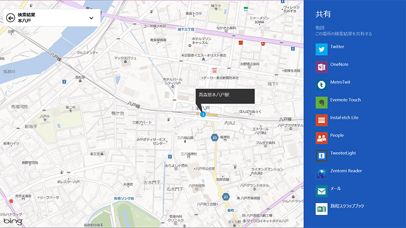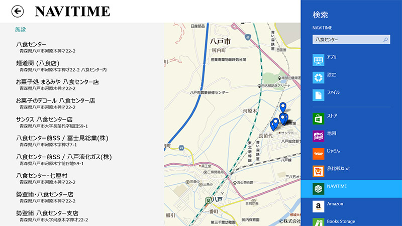 | Windows 8のチャームを用いれば、複数アプリにまたがって効率よく検索していける |