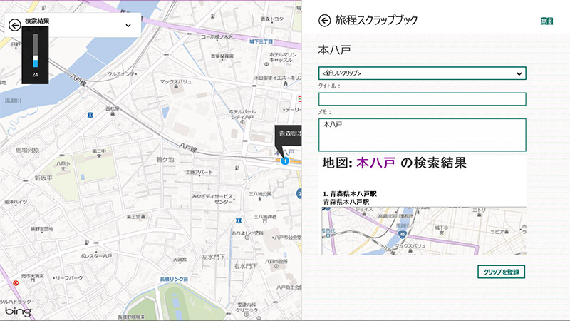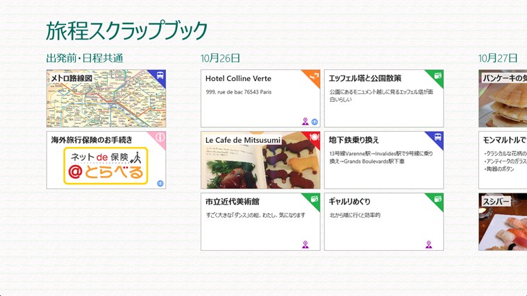 書く内容は「クリップ」という単位で管理され、基本的に時系列表示される。日時の選択は自由に可能で、なおかつネット接続がオフラインの状態でも主要操作が行える。「クリップ」は、チャームの「共有」機能に対応したアプリから、アプリをまたいで作成することもできるので、WebサイトのURLや地点情報、写真など、様々な情報を手軽に「クリップ」として保存していける。単純な日誌帳としてはもちろん、旅行の予定をあらかじめ記入しておく“しおり”として使うなど、用途はいろいろ考えられる。