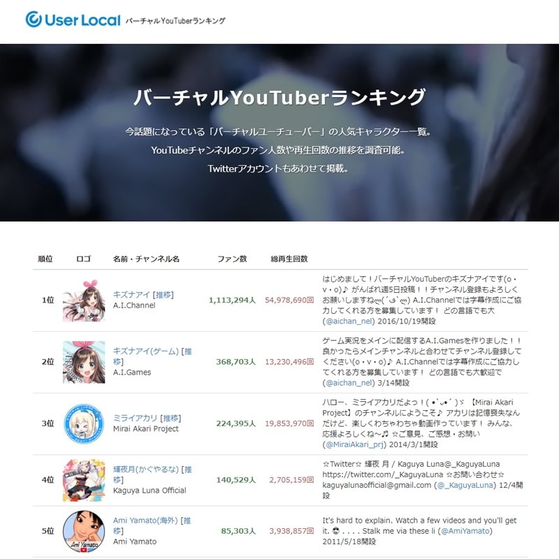いま最もアツいVR?「バーチャルYouTuber」のランキングサイトが登場