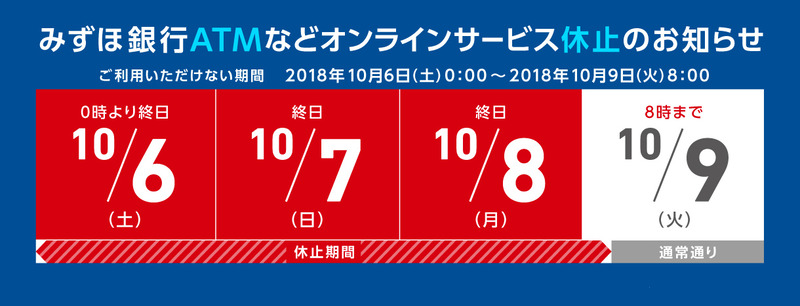 今週末の3連休はみずほ銀行ATM休止。9日(火)8時再開