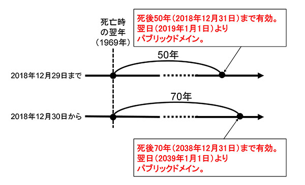 著作権保護期間が50年から70年に延長。一部非親告罪化も