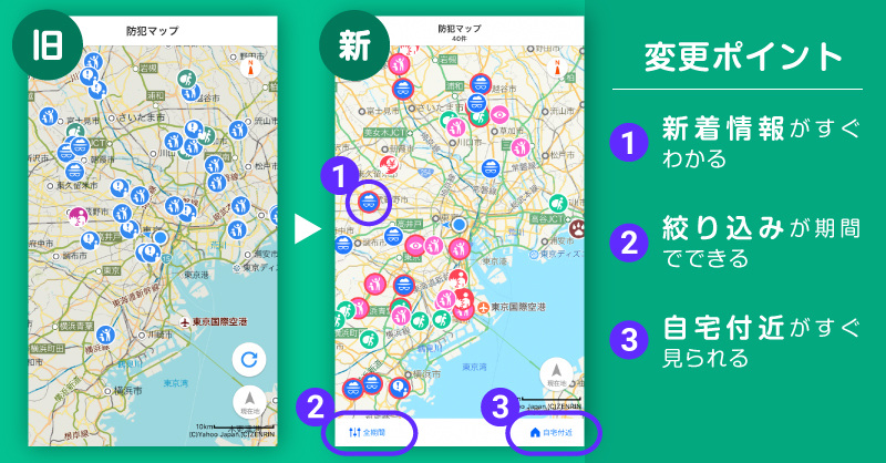 Yahoo! MAPの「防犯マップ」、24時間以内の情報に赤丸でわかりやすく