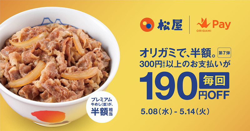 松屋で「オリガミで、半額。」。牛めし等が190円引き