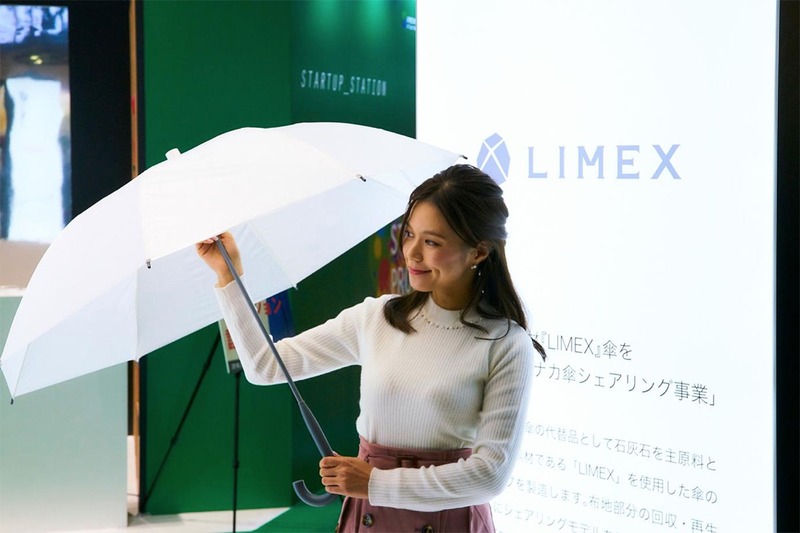 石灰石からできた新素材傘のシェアリング。実施場所は品川駅、横浜駅、大宮駅