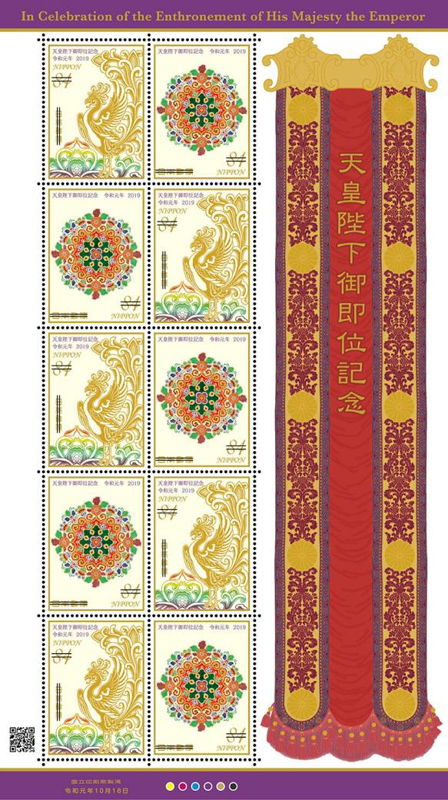 天皇陛下即位を記念した特殊切手、鳳凰と宝相華文様をデザイン