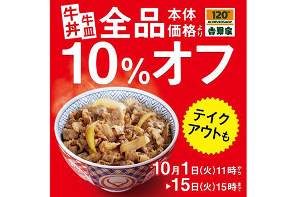 吉野家、増税の10月1日から牛丼・牛皿全品10%オフ