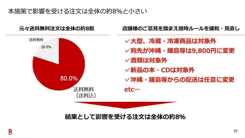 楽天、送料無料化の必要性を説明。影響を受ける注文は8%