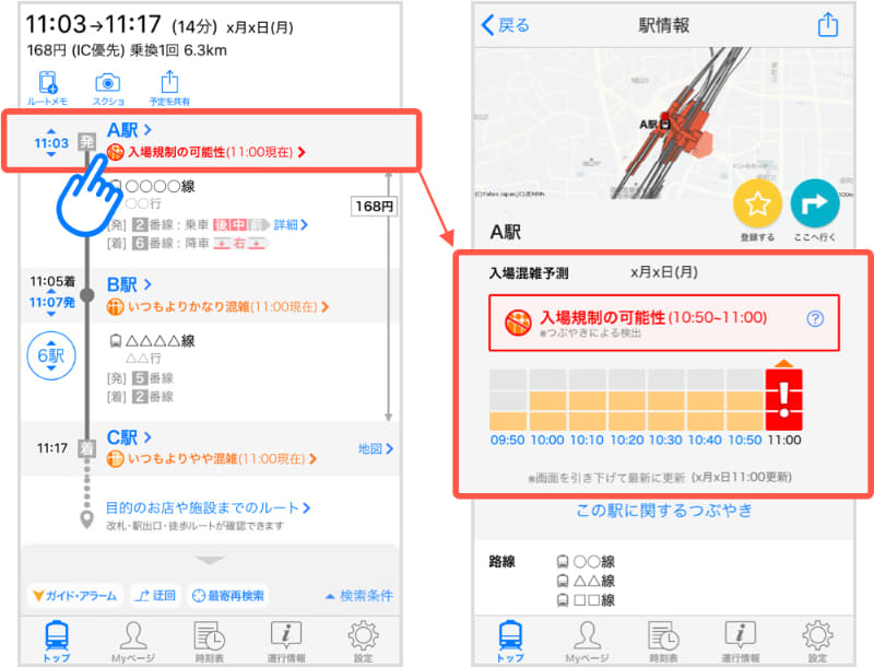 Yahoo!乗換案内、「混雑予報」を前後のダイヤが確認できる画面に表示