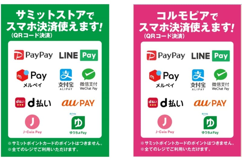サミットストア、d払い、au PAY、J-Coin Pay、ゆうちょPay対応