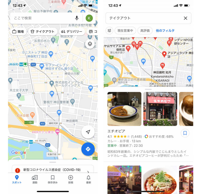 食べログ、近くのテイクアウト可能店舗をワンタップ地図検索
