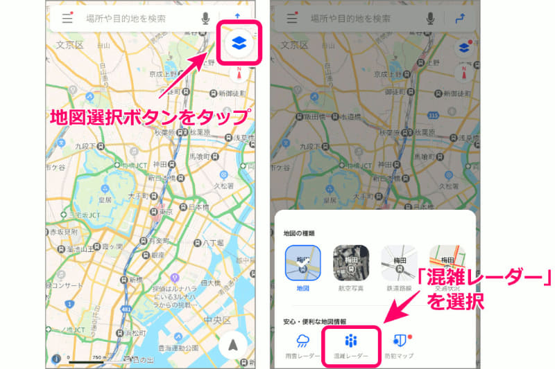 Yahoo! MAP、混雑レーダーで「青・緑・赤」の混雑表示