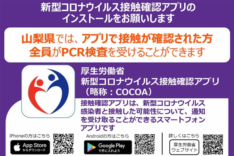 山梨県、コロナ接触確認アプリ利用を呼びかけ。接触判明者は全員PCR検査