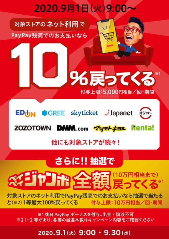 PayPay、8月1日、2日に抽選最大20倍還元。8月は中小店舗で“ジャンボ”